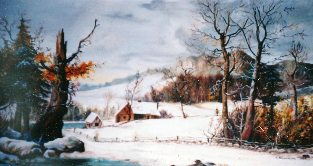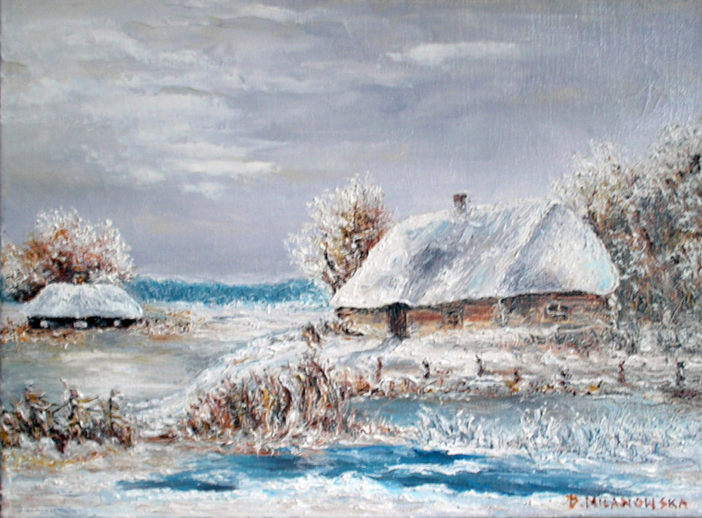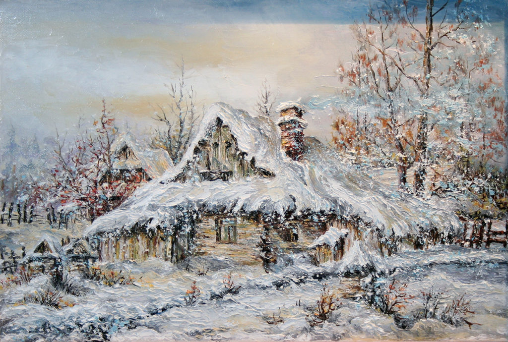 kopia: ,,Chatki zimą”. Olej – szpachla, 50 X 40, 2004r.