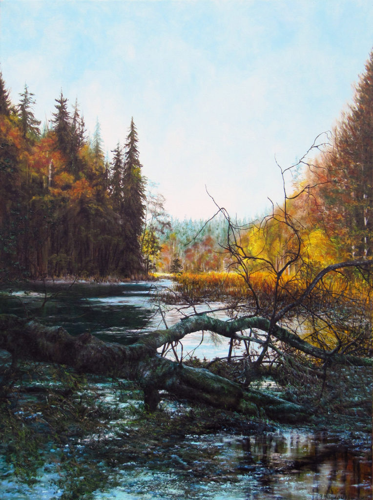 ,,Czarna Hańcza”, na podstawie fot. Wł. Łapińskiego. olej – szpachla, 90 X 70, 2006r.
